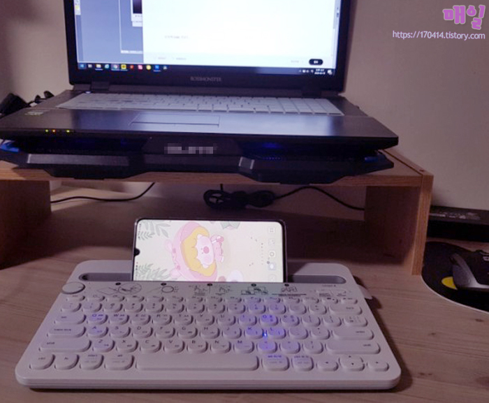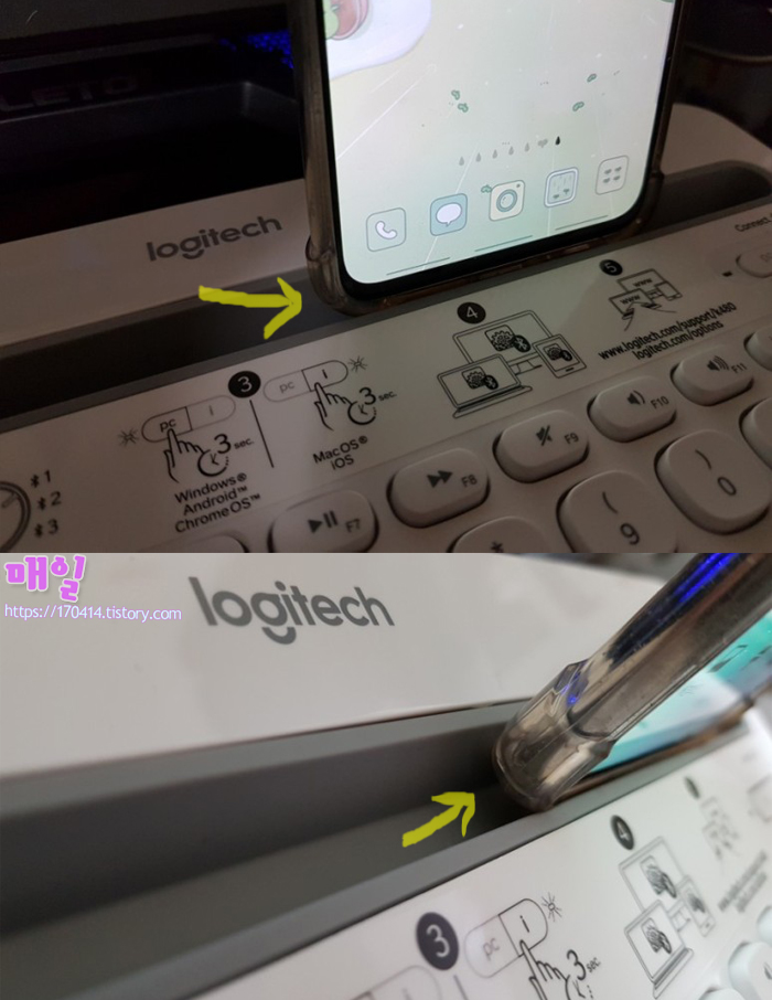 그렇기에 폰을 올려두고 쓸 수 있는 K480이 더 나을 거 같아 선택을 하게 되었던 건데 K480 키보드를 받아서 설치를 하고 써보려 거치대에 핸드폰을 올려놓았을 때 생각도 안 했던 일이 생겼습니다.