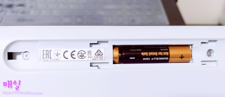키보드를 구매했었던 다른 분들의 후기를 봤을 때 건전지가 함께 들어있지 않다고 봤었는데 제가 받은 키보드 안에는 들어있었습니다. 솔직히 그래서 반품했던 제품을 확인도 안 하고 보내준 건가 잠시 생각했었습니다. 바로 직전에 노란 테이프를 제거했다는 것을 순간 잊고 말이죠.