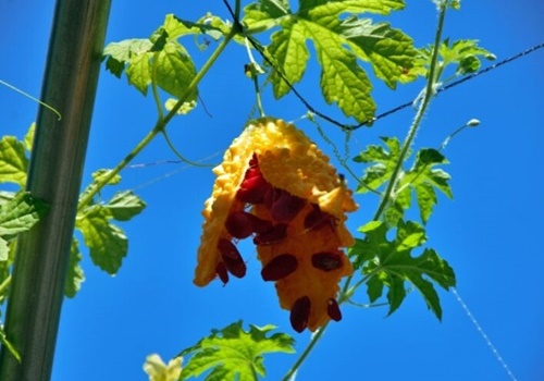 여주(momordica charantia)는 박과에 딸린 한해살이풀로 비터 멜론(bitter melon)으로도 불립니다. 독특한 모양의 열매로 인해 일명 당뇨 잡는 도깨비 방망이로도 불릴만큼 당뇨에 좋은 음식으로 알려져 있습니다. 작은 재래종에 비해 개량종은 크고 굵습니다. 여주는 특히 열매가 특이한데 길이 7~9 센티미터 정도 되는 길둥근 모양으로 조그만 혹 모양 돌기가 열매 가득 돋아 있습니다. 그 열매가 익으면 갈라져서 붉은색 육질에 싸여 있는 씨가 드러납니다. 영어로 비터멜론, 일본어로 고야로 불리웁니다.