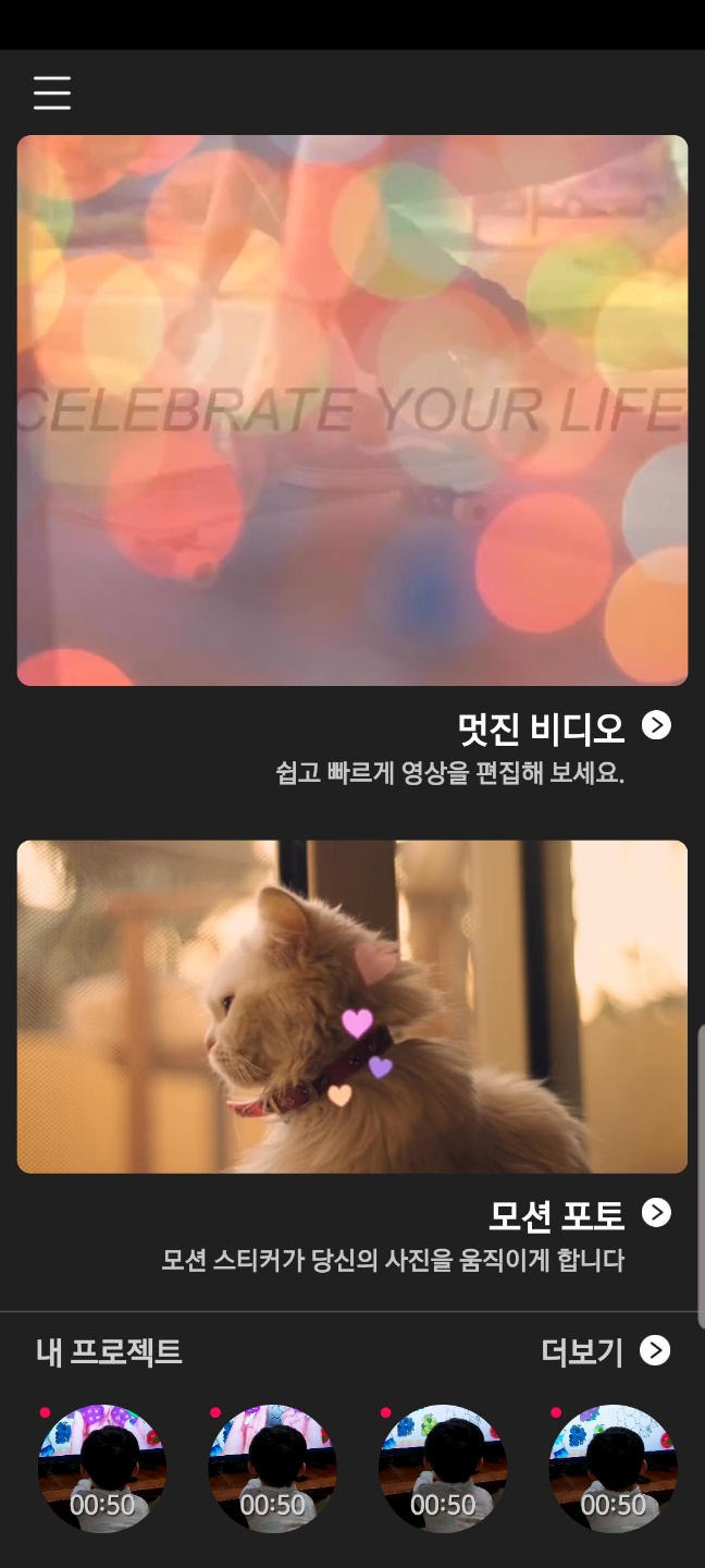 메뉴를 클릭해서 이것저것 눌러보면 금방 감이 잡히는 쉬운 앱이었습니다. <멋진 비디오>로 들어가서 영상편집을 해봤습니다.